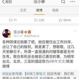 不管怎样,当事人其实都不希望再揭当年伤疤。“只是创业25年,累了想歇歇”。各位看官,大家歇了吧!人家汪小菲都说了,“各种阴谋论都散了吧,张兰就是想歇歇了”。有微博为证: