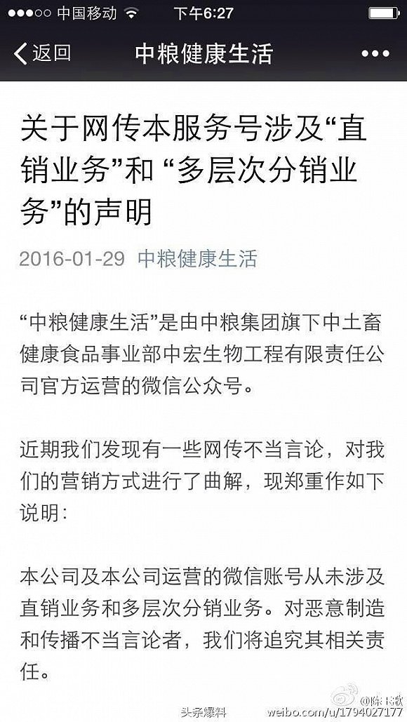 但在1月29日,中宏生物工程有限责任公司为此专门发布了一条关于网传本服务号涉及“直销业务”和“多层次分销业务”的声明,内容包括,近期我们发现有一些网传不当言论,对我们的营销方式进行了曲解,现郑重作如下说明:本公司及本公司运营的微信账号从未涉及直销业务和多层次分销业务。对恶意制造和传播不当言论者,我们将追究其相关责任……这则公告的阅读量为10万+。