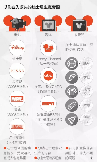 迪士尼有一条长长的生意链。迪士尼、皮克斯和漫威三家动画创意公司是它的源头,直接产生的收益并不多,2015年,影业部分的收入为73亿美元,占公司总收入的14%。在内容生产的下一环,迪士尼拥有自己的动画片独播频道Disney Channel。