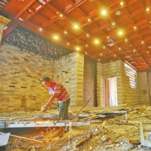 大厅内,金碧辉煌的楼顶和墙体以及各种灯饰等都还没有拆除,大厅东侧的一处1尺高的平台正在拆除。在切割、拉扯、装卸等杂音交响中,东北角一名工人拿着大锤对着室内非承重墙猛砸,已砸出一个大窟窿。很显然,这里正进行大规模拆除。