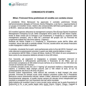 新浪体育讯 北京时间8月5日,AC米兰俱乐部主席贝卢斯科尼旗下的Fininvest财团官方发表声明,他们与一家中国企业就俱乐部转让已经达成协议,这家企业将以7.4亿欧元收购米兰99.93%的股份。