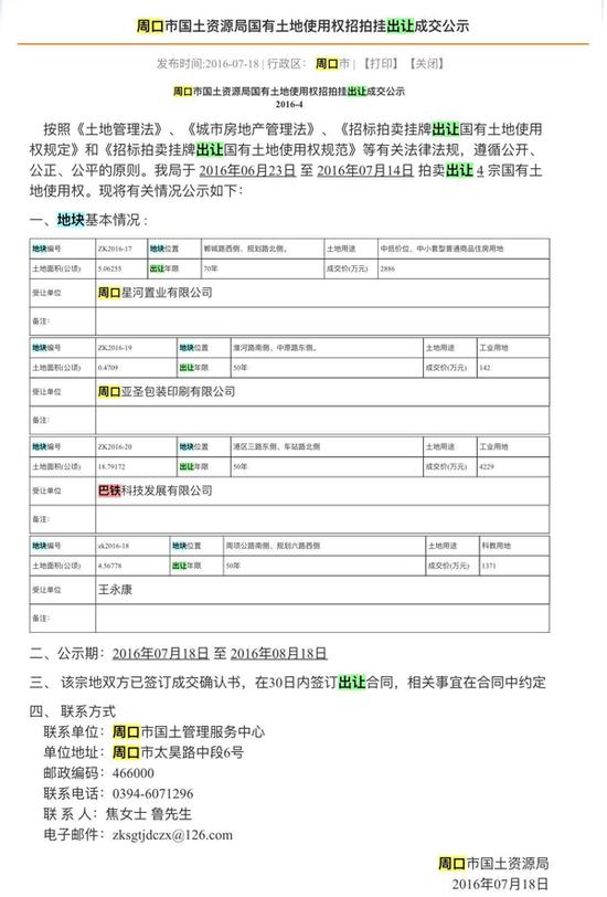 澎湃新闻记者从国土资源部官方网站获得的一份周口市国土资源局国有土地使用权招拍挂出让成交公示显示,在6月23日至7月14日拍卖出让的4宗国有土地使用权中,巴铁科技发展有限公司已经获得了其中一宗面积为18.79172公顷的地块。