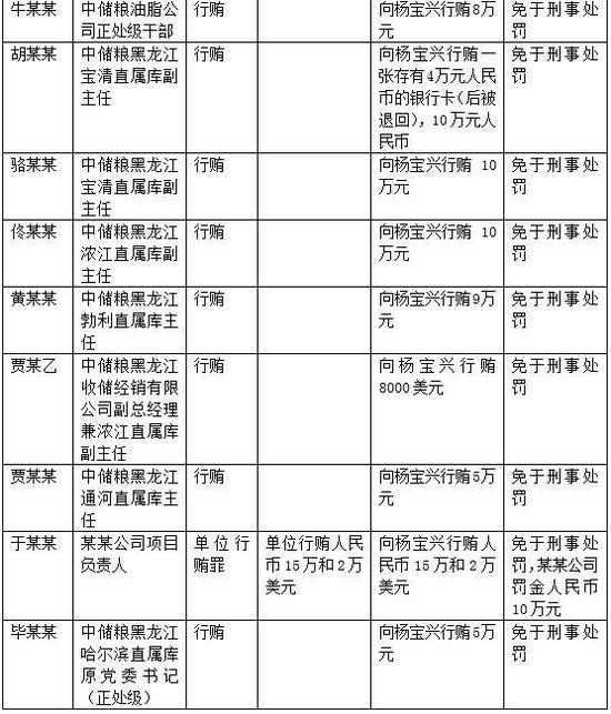 2015年9月16日,中储粮油脂公司正处级干部牛某某,中储粮黑龙江宝清直属库副主任胡某某、骆某某,中储粮黑龙江浓江直属库副主任佟某某,中储粮黑龙江勃利直属库主任黄某某五人均同一天到佳木斯市有关检察院投案。上述五人各自的判决书显示,他们均有向杨宝兴行贿的指控,但最后他们都被判犯行贿罪,免于刑事处罚。