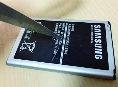 在保证安全的前提下,记者先用利器对三星原装电池的外表进行戳击,电池的表面很轻易就被击穿,但是并没有出现视频中爆炸的情况。但记者感觉这块原装电池的表面已经发热,而且可以闻到一股异味。国产的电池也是如此。