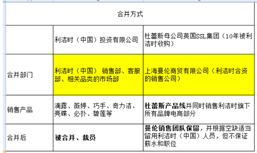 此外,有一名利洁时(中国)员工对记者表示,公司有一个“员工意愿调查表”,里面有是否愿意降低职位、是否愿意降低薪水、是否接受异地调动等几个问题。而他得到的小道消息是,因为总部没有准备那么多赔偿金,所以裁员方案迟迟没有出来。随后又有内部员工向记者透露他得到的最新消息是销售客服部只留下leader,其他人员要么转岗,要么被裁。而让有些员工比较气愤的是,既然是合并为什么只是裁掉利杰时的销售,却保留曼伦的销售团队。上述人员表示按道理应该是竞争上岗,而不是直接裁掉某一方。