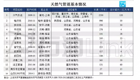 此次公开的天然气管网里程达5418公里,设计管输能力447亿方/年。其中,最长的管线是于2009年11月建成投产的“川气东送”线,总长达2230公里,设计管输能力为120亿方/年;而最短的为去年9月投产的“南乐寺庄管道”,长度仅为27公里。