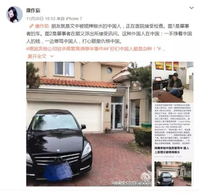 昨天傍晚,网友@康作茹在微博爆料称,昨天中午12点左右,北京顺义中央别墅区发生了一起外国公司驻华高管当众辱骂中国人的事件。