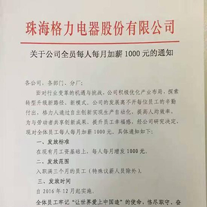 这份加薪文件中称,公司的发展离不开每位员工的辛勤付出,格力人通过自主创新实现生产自动化,提高人均效率,为与劳动者共享创新成果,提升员工幸福感,经公司研究决定,对全体员工每月加薪1000元。