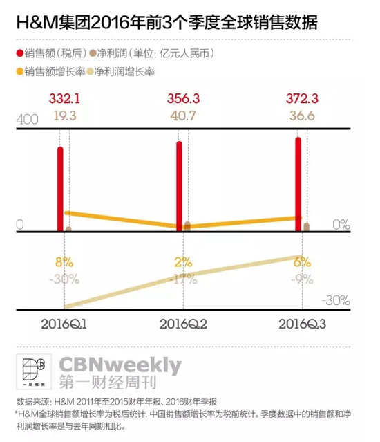 同时,Karl-Johan Persson从H&M全球看到的数据也并没有好到哪里去。2016年的前三个季度,尽管销售额仍维持了个位数的增长率,净利润却在下滑。