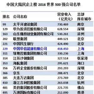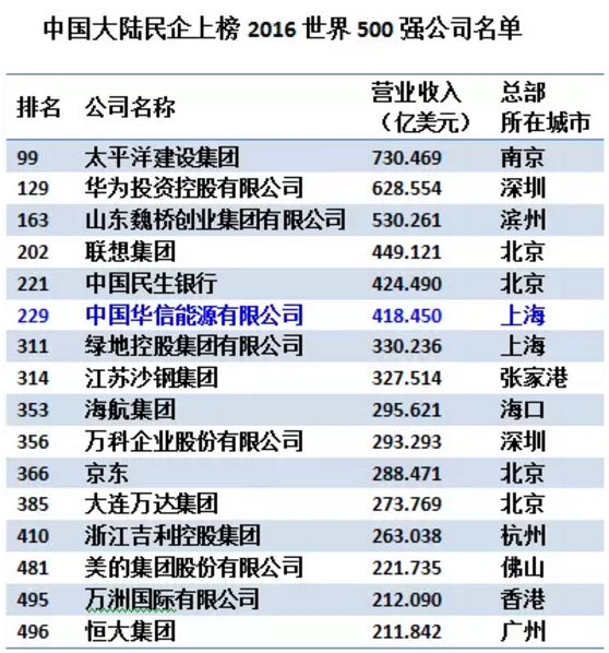 在华信之前48家中国大陆企业中,国企占了37家;股份制金融机构4家(中国平安41位、招商银行189位、兴业银行195位和民生银行221位),台资1家(鸿海25位),港资1家(来宝集团116位。李嘉诚的长江和记实业排在473位)。其它是大陆民营企业,太平洋建设集团位列第99位(730.4亿美元)、华为129位(628亿美元)、山东魏桥163位(530亿美元)、正威国际190位(477.9亿美元)、联想集团202位(449.1亿美元)。