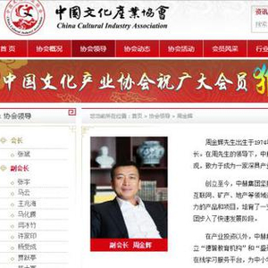 更让人无法想象的是,通过网络搜索,居然仅仅只有一张周总的照片。而且,即便是中赫集团自己的官网上,居然也找不到周金辉本人的照片!仅有的一张公开照片,也就是出任“中国文化产业协会”副会长时、在产协官网上介绍副会长时的那张照片。在这个协会中担任副会长的,就包括马云、马化腾、许家印等诸多为人所熟知的呼风唤雨式的大人物。不过,据知情人士透露,周总早就退出了这个协会,几次希望自己的照片能够从这个协会的官网上撤掉,一直未得到正面答复,但可以确定的是,周总已经与这个协会毫无关系了。