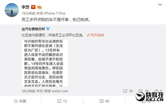 汽车之家创始人李想则认为,员工多开点别的车不是坏事,知己知彼。
