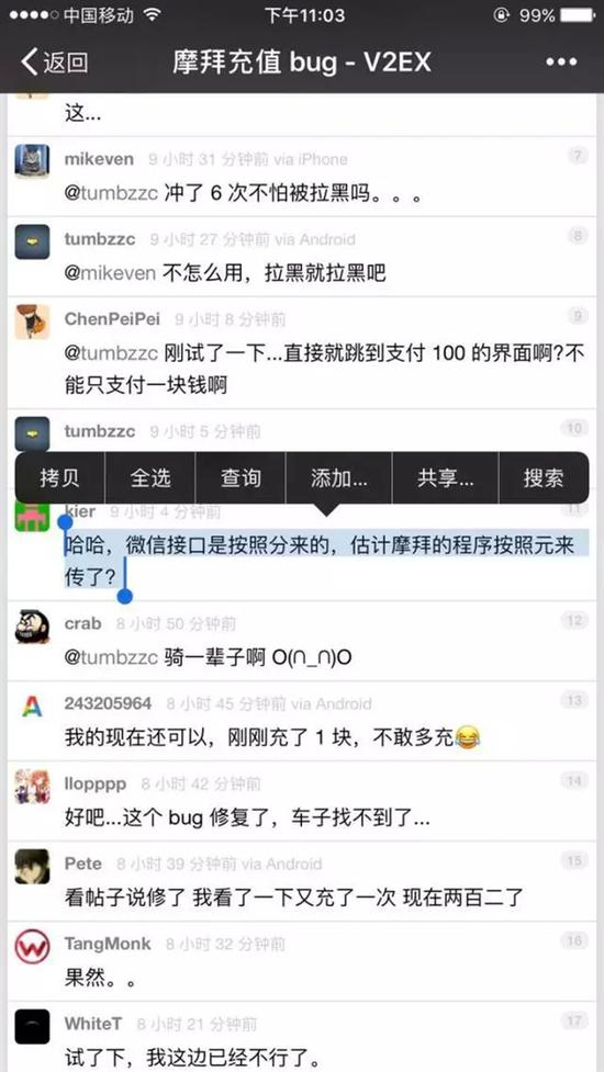 摩拜惊现充1元送110元漏洞 回应称不要求退款