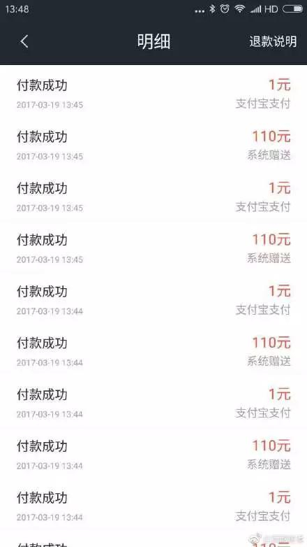有网友提供截图显示,从昨日上午到12:15-13:42,其连续充值7次1块钱,系统连续7次返值110元,共计返值770元。