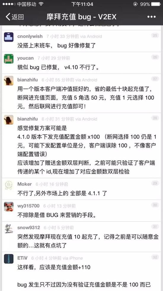 昨日上午,有多名用户发现,摩拜单车安卓最新版(4.1.0版)出现技术漏洞,用户充值1元,竟然返现110元。