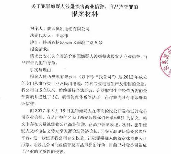 该公司表示,帖中称公司为“一家不符合国家标准的小作坊”、“电缆全部为偷工减料”以及“该公司及负责人违法进行招投标”等表述均无事实依据,还说已经向公安机关报案,告举报者损害商业信誉。