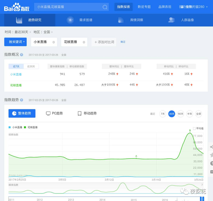 在百度指数上以“小米直播”为关键词进行检索,从3月20日到27日,小米直播整体搜索指数为941,而由周鸿祎所投资的花椒直播在同期搜索指数为45985。