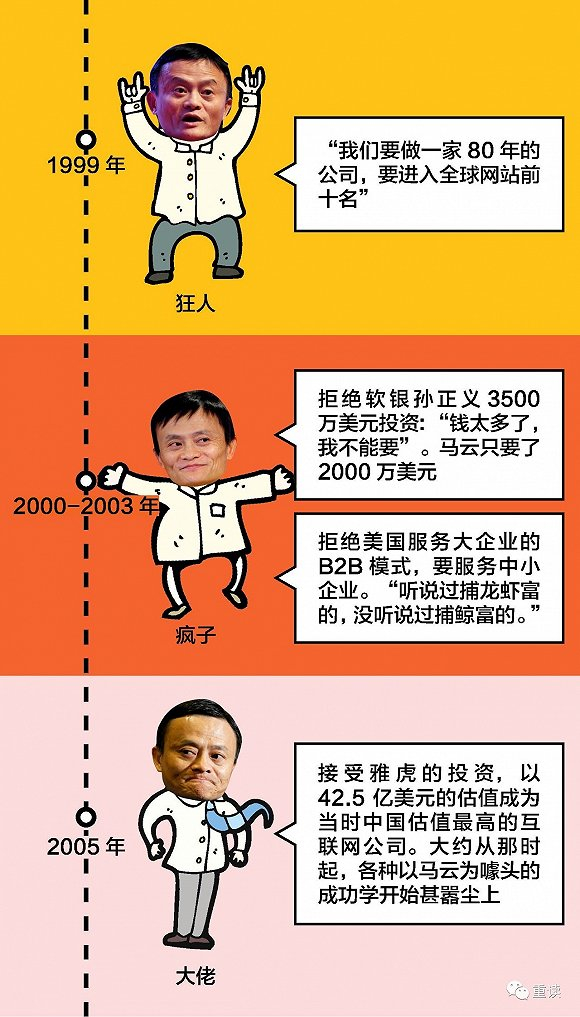 马云则一再宣扬,阿里巴巴是建筑于价值观之上的公司,“我们公司所有的策略、战略都基于价值观。如果我们新来的员工业绩不好,没关系。如果违背我们的价值观去骗客户。好。你就一句话也不要讲了。不要说你,我也要死了。”