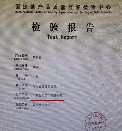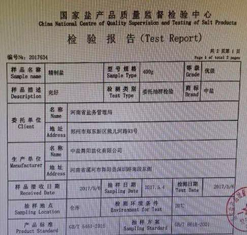澎湃新闻注意到,5月8日,网络上传出上述检测“合格”的“国家盐产品质量监督检验中心”检测报告文件照片,委托单位为“河南省盐务管理局”,生产单位分别为“中盐皓龙盐化有限责任公司”和“中盐舞阳盐化有限公司”,抽样日期均为5月4日。