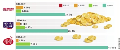 根据招股书,2014年-2016年,香飘飘净利润分别为1.85亿元、2.03亿元和2.66亿元,三年净利润总和6.54亿元,而这三年香飘飘的广告投放共计9.44亿元,广告投放高于公司净利润。