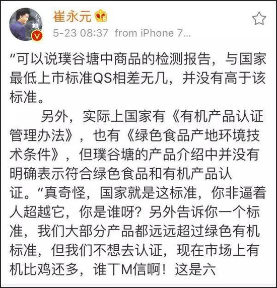 崔永元回应:“我们公司的产品标准不比农业部食堂的特供差”“我们大部分产品都远远超过绿色有机标准,但我们不想认证。”