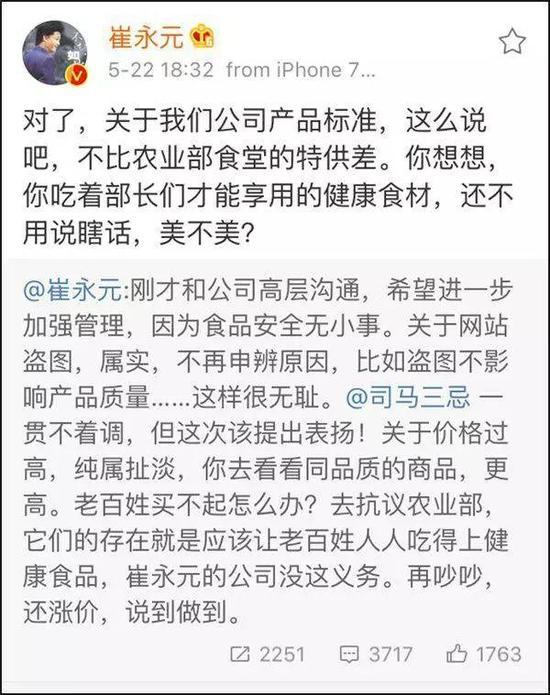 关于这个质疑,崔老师认错很利索。“关于网站盗图,属实,不再申辨原因,比如盗图不影响产品质量……这样很无耻。”他用这38个字回应了质疑者1820字图文并茂的长微博。