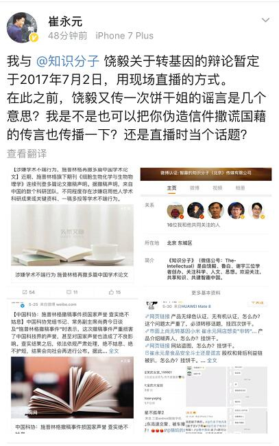 “过去的一周,崔永元共发了73条微博,其中有62条是关于转基因。17条是在为自己的“非转基因”新事业站台,另外45条则是沉浸在与敌军的厮杀中。其中,撕李铁10次,撕饼干姐6次,撕方舟子3次,黄西Joe_Wong2次,微表情专家纪宇2次,网络作者楚白2次,“邵井子1314”2次,千钧客2次,碟海狂人、孤烟暮蝉、地瓜熊老六、司马3忌各1次。”