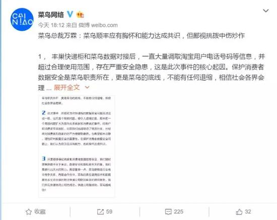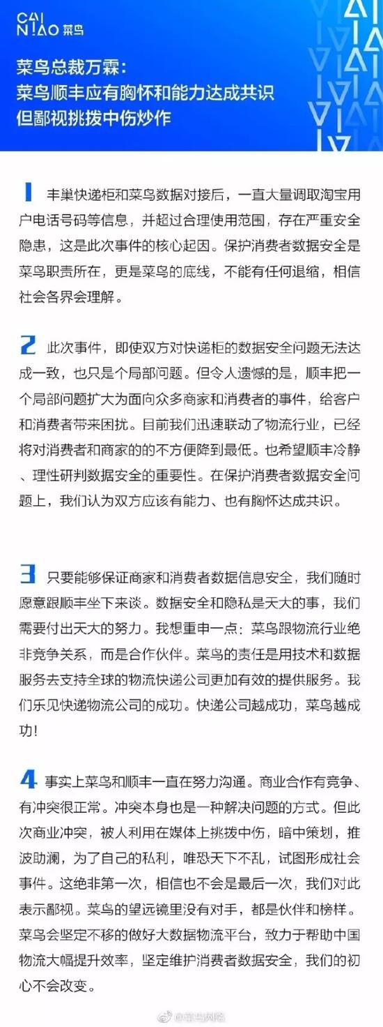 6月2日18时消息,对于菜鸟顺丰之争,菜鸟总裁万霖发出最新声明表示:
