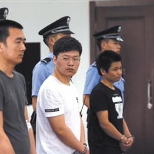 昨日,智联招聘员工申欢(左一)李超(左二)和从他们手中购买简历的余秋云(左三),被控侵犯公民个人信息罪受审。新京报记者 王贵彬 摄