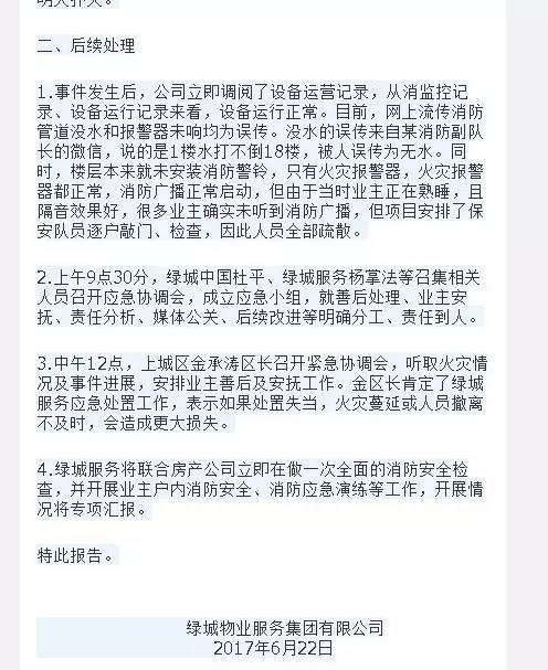 之后,网上出现了一篇绿城集团内部的“杭州6.22火灾事故基本过程及情况汇报”,其中透露这些豪宅所在的楼层本就未安装消防警铃,只有火灾报警器;但宣称火灾发生后,报警器正常都工作,通知到了保安,消防广播也正常启动了,只是由于当时业主正在熟睡,且隔音效果好,未听到消防广播,才安排了保安队员逐户敲门、检查,疏散人员。