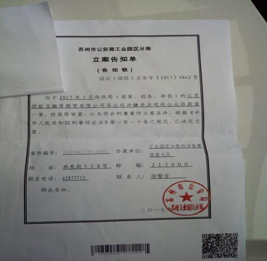 7月10日,多名投资者代表再次来到苏州工业园区公安分局,拿到了立案告知书——苏州警方对绿能宝以“涉嫌非法吸收公众存款”立案侦查。