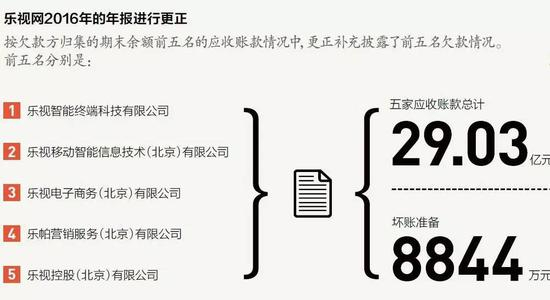 在乐视网发布的对2016年财报更正的报告中显示,应收账款中的前五名均为公司关联方,共计欠款29亿元,其中前两家是和乐视手机相关:乐视智能终端科技有限公司、乐视移动智能信息技术(北京)有限公司,共计欠款乐视网21亿元。