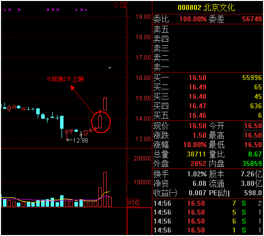从A股市场来看,《战狼2》的火爆,上市公司北京文化成为了最大赢家。自《战狼2》7月27日上映,至今3个交易日,先是首日(上周四)上映上涨4.36%,第二天(上周五)再大涨6.16%,再经过周末两天的发酵,今天北京文化股价直接一字涨停,收涨10.00%,3个交易日北京文化上涨21.86%,相当于2个涨停。