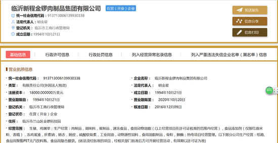 《财经啸侃》特约、独家撰稿人五谷君注意到,金锣集团的法定代表人为明金星,注册资本1.8亿美元(折合人民币超过10亿元),属于外国法人独资企业。