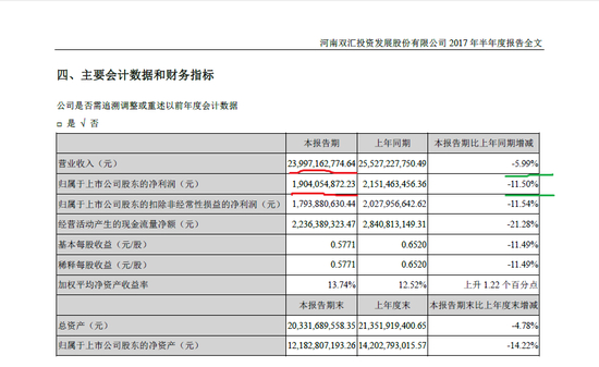 2017年上半年,双汇发展实现营业收入不到240亿元,和去年同期255亿元相比,降幅在6%左右,“蒸发”15亿元;归属于上市公司股东的净利润约为19.04亿元,和2016年上半年约为21.51亿元相比,跌幅在11%以上。