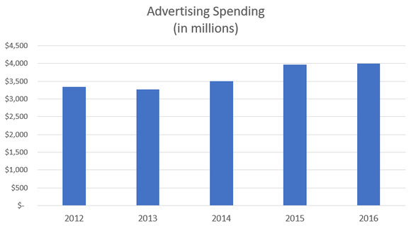 快速消费品大公司总在创造新的概念,随之而来的就是广告投入。过去一年,可口可乐在广告上花了40亿美元,比2012年多了7亿美元。广告花销占总销售额的比重(这也是所谓的营销费用率)也在上升,2012年只有7%,4年后涨到了10%。