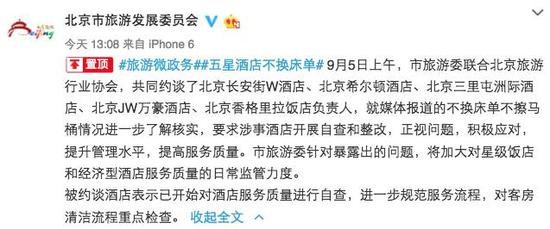 9月5日下午13:08,北京市旅游发展委员会发布官方微博,表示上午约谈了北京长安街W酒店、北京希尔顿酒店、北京三里屯洲际酒店、北京JW万豪酒店、北京香格里拉饭店负责人,就媒体报道的不换床单不擦马桶情况进一步了解核实,要求酒店开展自查和整改。市旅游委针对暴露出的问题,将加大对星级饭店和经济型酒店服务质量的日常监管力度。被约谈酒店表示已开始对酒店服务质量进行自查,进一步规范服务流程,对客房清洁流程重点检查。