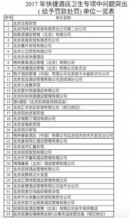 9月4日下午,北京市卫监所公布对北京691家快捷酒店卫生情况的检查结果,其中46家不达标,35家被罚款。七天、速8、如家、桔子酒店等连锁快捷酒店品牌也榜上有名。