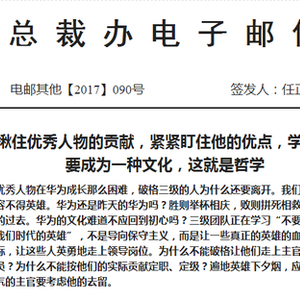 前日,任正非公开对一名敢于说真话的员工连升两级还叮咛专人保护,这次又点名到人,这其中的用意也就不难猜测了。从此次的邮件结构来看,分为两个部分,上半部分主旨在于,“我们要紧紧揪住优秀人物的贡献,紧紧盯住他的优点,学习他的榜样。这要成为一种文化,这就是哲学”并且以口语式的语气加双重否定的排比句型表明了其对优秀人物的重视和态度,看起来很口语,但是很强硬。