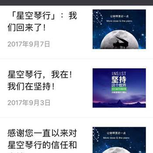 9月1日中小学开学当天,公号还在推“开学季”活动,而9月2日,推送文章便成了“感谢您一直以来对星空琴行的信任和支持”,9月3日则是“我们在坚持”。此后直到今天9月7日8:00,公号推送了最新一篇消息:“我们回来了!”