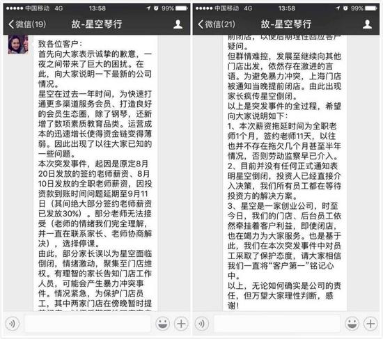 今天早晨7:30分流传在星空琴行学员维权群中的微信信息曾指出是“由于公司管理存在问题,造成拖欠教师一部分工资。9月2日,由于担心部分教师因此产生罢课行为造成连锁反应,所以,凌晨2:05分,公司创始人、CEO周楷程先生以邮件形式通知了所有门店,9月2日起暂停营业。”