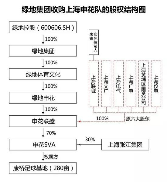 按照正常的收购逻辑,既然申花联盛被绿地集团全资收购了,申花SVA70%股权和康桥足球训练基地理因归绿地集团间接控股。申花SVA剩余30%为上海浦东康桥(集团)有限公司持有,它的实际控制人是上海浦东新区国资委旗下的上海张江集团。