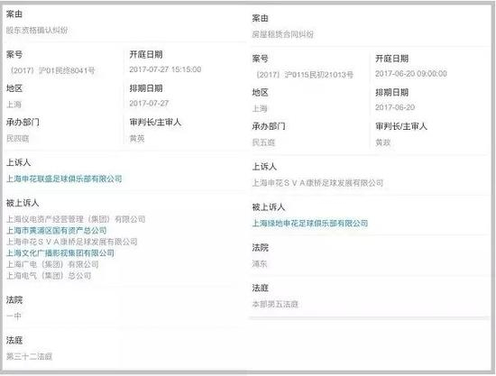 乐居在查阅工商资料显示,申花联盛上诉上海仪电、上海黄浦区国有资产总公司、上海文化广播、上海广电和上海电气、上海申花SVA等6家公司的案件已于2017年7月27日开庭,案由是“股东资格确认纠纷”。