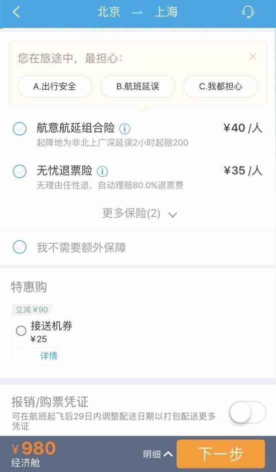 在普通预订页面,所有的保险产品和接送机券、贵宾休息室均未默认勾选,消费者可以根据自己的需求自行选择。