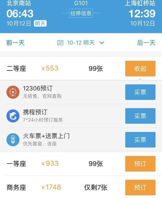 为了测试携程在机票销售上的“改进”,周刊君尝试购买了10月12日从北京飞上海的机票。页面确实出现了“普通预订”的选项。