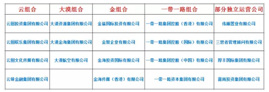 从业务方面来看,这些公司没有实际联系,只是名字联系比较紧密,可划分为“云组合”、“大漠组合”、“金组合”、“一带一路”以及部分独立运营公司。