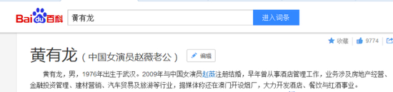 在黄有龙目前的百科介绍中,先且不说他作为一企业家“富商”,为何对从商经历“生意涉及房地产、金融、汽车等”只言片语。紧接着大篇幅介绍的却是他的感情经历。