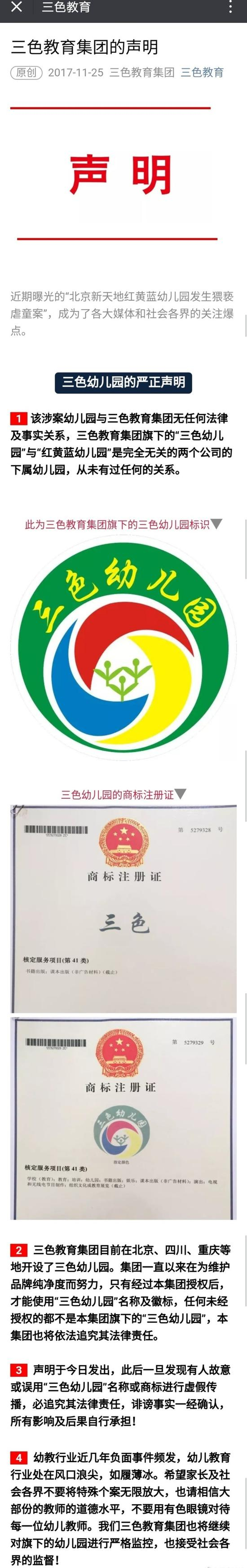 声明中表示,此后一旦发现有人故意或者误用“三色幼儿园”名称和商标进行虚假传播,必追究其法律责任,诽谤事实一经确认,所有影响及后果自行承担!