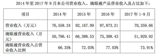 2014年至2016年,分别实现营业收入7.66亿元、9.22亿元、9.79亿元。其中,滴眼液营业收入分别为:5.08亿元、6.64亿元和7.54亿元。