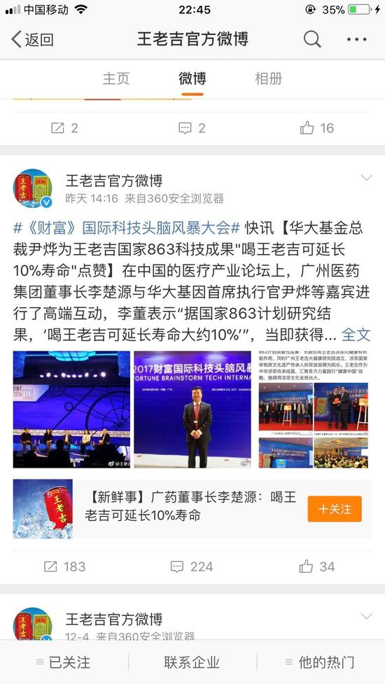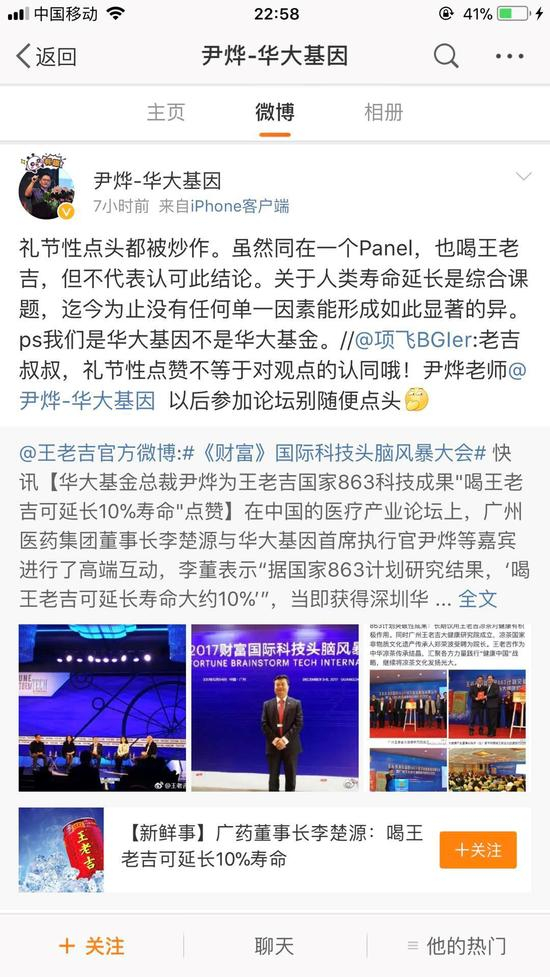 今天,在王老吉的官方微博上,发布了这样一条信息,宣称:在《财富》国际科技头脑风暴大会上,王老吉公布了国家863科技成果,那就是喝王老吉可以延长10%的寿命,因为这个成果,广药集团董事长李楚源与华大基因首席执行官尹烨在医疗产业论坛上进行了高端互动,这个成果深得尹烨的认同,为此,该官方微博以“华大基金总裁尹烨为王老吉国家863科技成果‘喝王老吉可延长10%寿命’点赞。”为标题进行传播。